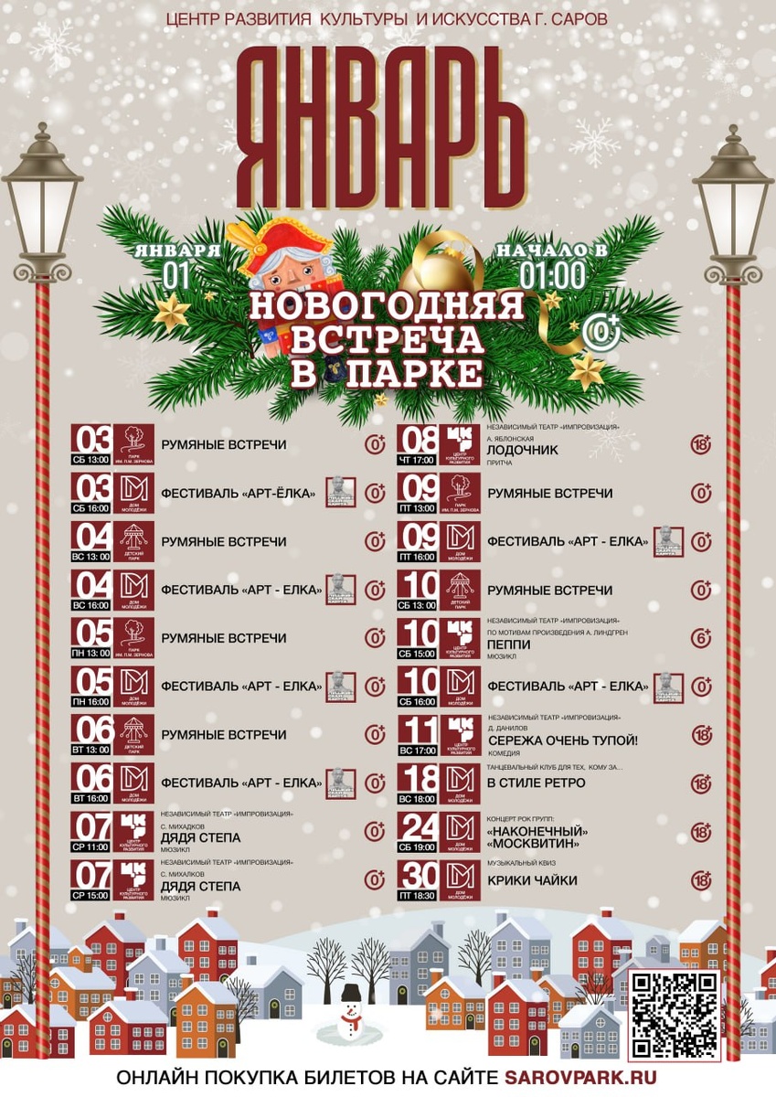 1 января в 01:00 всех-всех-всех будет ждать зажигательный праздник возле елки в самом большом парке города. Начиная с 3 января, в Доме молодежи в 16:00 открывается фестиваль творчества и искусства "Арт-Елка". 3, 4, 5, 6, 9, 10 января в 13:00 пройдут "Румяные встречи" в парке им. П.М. Зернова и Детском парке на Сосина. Весело будет как детям, так и взрослым. И не забываем про спектакли и концерты на площадках Центра развития культуры и искусства.