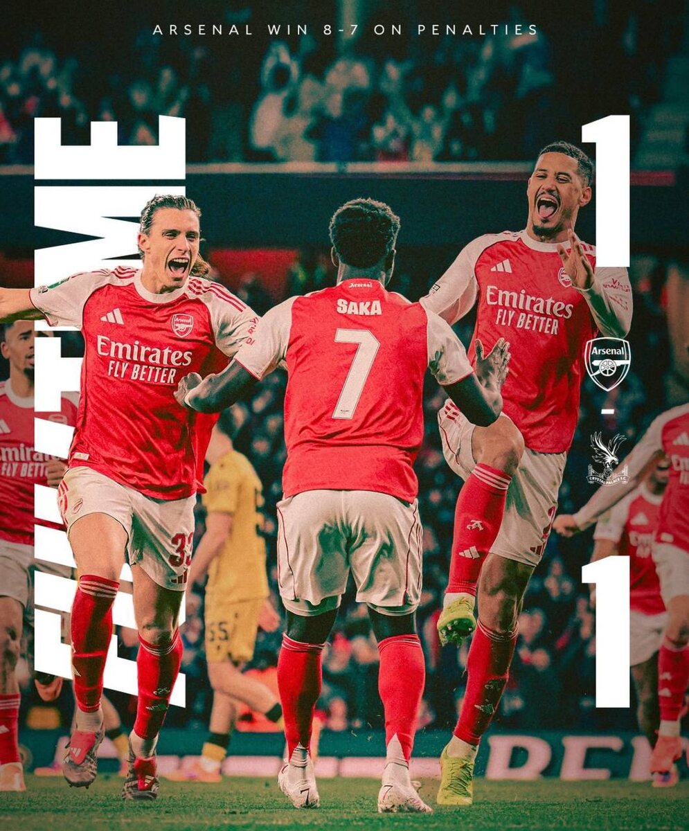 😏 Потная игра вышла, несмотря на полный контроль и преимущество по игре. И меня чуть напрягают последние матчи Арсенала, где команда вымучивает голы Возможно, это связано с ротацией, которую делает Артета. И это правильно, но может как раз это и сказывается на результативности. Но результат есть, это главное 👍 Вчера конечно был явно не вечер защитника КП Максанса Лакруа. Сначала срезал мяч в свои ворота, а в серии пенальти единственный не реализовал удар 🙁 Впереди у Арсенала дополнительные два матча в кубке против Челси 🤜 ➡️ Подписаться на ФутХайп