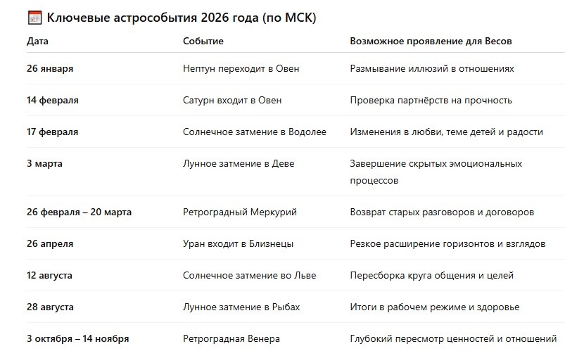 По работе 2026 может принести Весам выход в более сильную позицию через команду и связи. Особенно во второй половине года. И, кстати, 12 августа солнечное затмение во Льве - это ваш 11 дом гороскопа: друзья, команда, аудитория, окружение. У кого-то это будет новая группа/сообщество, которое реально двигает карьеру.