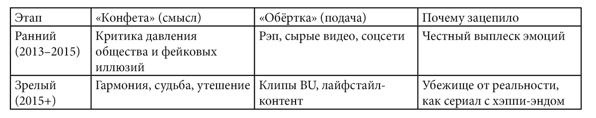 Представьте поп-звезду как конфету: внешняя «обёртка» – это яркие клипы, танцы, соцсети и живые шоу, которые цепляют глаз. А внутри – «конфета», отклик на социальные настроения, слова, что эхом отзываются в душе слушателя, соответствующие его мыслям и эмоциям.