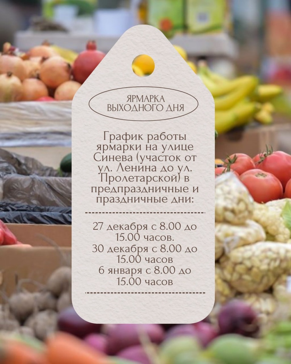 ❕ Уважаемые жители и гости города! График работы ярмарки на улице Синева (участок от ул. Ленина до ул. Пролетарской) в предпраздничные и праздничные дни: 🟤 27 декабря с 8.00 до 15.00 часов 🟤30 декабря с 8.00 до 15.00 часов 🟤6 января с 8.00 до 15.00 часов Во время проведения ярмарки движение автомобилей на данном участке дороги перекрыто. Будьте внимательны!