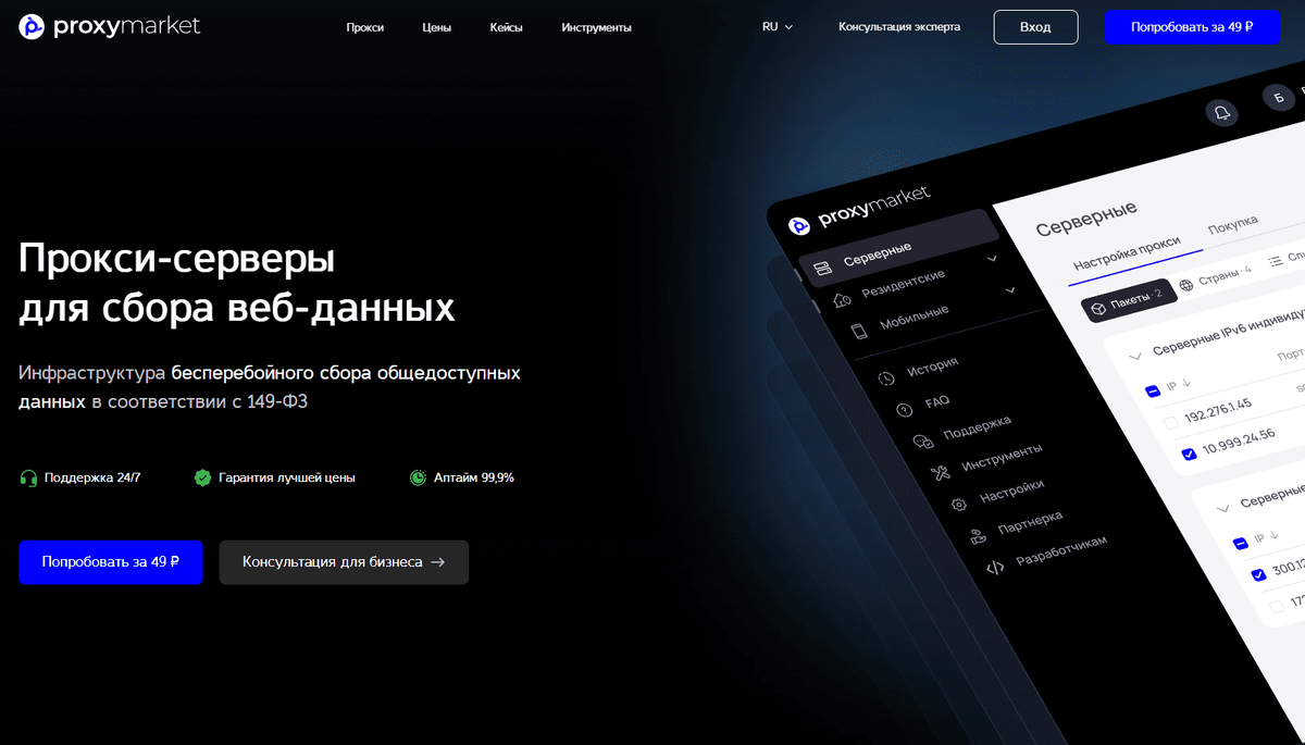 Proxy Market – подойдёт, если вам нужен понятный сервис аренды прокси для ежедневных задач на ПК: браузер, парсеры, софт для работы с маркетплейсами и аккаунтами. Сильная сторона – быстрый старт и масштабирование: можно взять нужное количество адресов, оперативно заменить проблемные IP и держать стабильное подключение без ручной рутины.