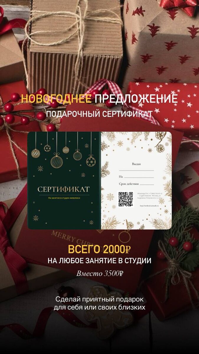 💗💗💗💗💗💗💗💗💗💗 ПРЕДЛОЖЕНИЕ от нашей студии! Мы ведь все любим делать подарки 🎁 и также любим их получать Поэтому к новому году 🎄 мы подготовили специальное предложение 🌸🌸🌸🌸🌸🌸🌸🌸🌸🌸 🌸🌸🌸🌸🌸🌸🌸🌸🌸🌸 На одно занятие 2000₽ вместо 3500₽ Он будет действовать на любое занятие в нашей студии без ограничения, так как он привязан не к стоимости, а к количеству уроков 1 занятие = 2000₽ Поэтому этот сертификат станет приятным подарком как для себя самих, так и для близких на Новый год 🎄 или дополнением к уже вашему подарку ✨для оформления вы всегда можете - написать нам в личные сообщения канала - написать в WhatsApp +79645566511 или позвонить по этому же номеру. Продажа сертификатов по этой стоимости продлится до 31 декабря 18:00.
