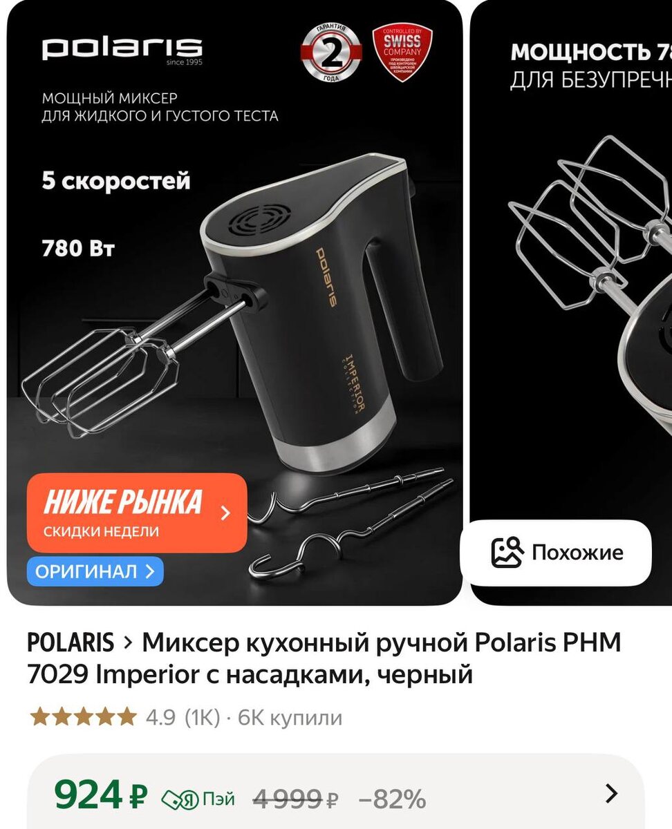 Миксер кухонный ручной Polaris PHM 7029 Imperior с насадками, черный