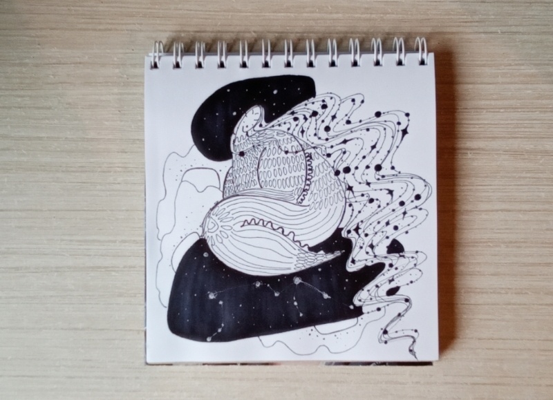 Взявшись за отрисовку этого знака, поняла, что давно не рисовала инопланетные образы. Набросав эскиз в черновик, перешла в основной скетчбук.