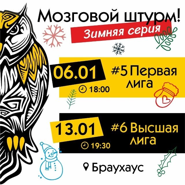 интеллектуальные игры так же, как их любим мы — вэлком 10 января (суббота) на QuizFest #8! 🎲 Все подробности по ссылке: vk.com/quizfest ❄️ 06.01, в 18.00 ❗️ - #5 ПЕРВАЯ ЛИГА - вопросы проще, отличная игра в том числе и для новичков ☃️ 13.01, в 19:30 - #6 ВЫСШАЯ ЛИГА - вопросы посложнее, но играть можно всем 📍 Встречаемся по вторникам в Ресторане «БрауХаус» 🎯 Регистрация на сайте: ufa.cheesequiz.ru/schedule/ ⚡️ Максимальное количество человек в команде - 8 Стоимость участия - 600 руб. с человека (оплата наличными или по QR-коду) Если у вас нет команды - приходите просто так! Найдём вам место! ☎️ По всем вопросам пишите - t.me/Tim_Sayfullin До встречи на играх! 💛 #интеллум #МШуфа #мозговойштурмуфа #анонсмш #квизуфа