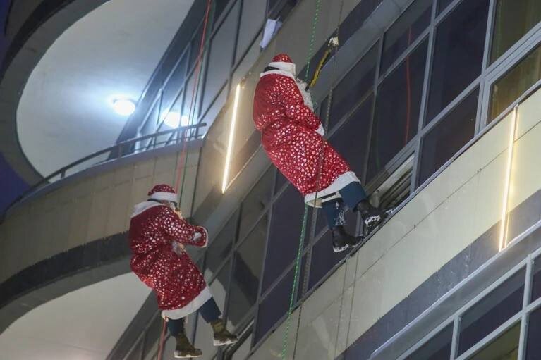 Деды Морозы спустились с крыши больницы Петербурга к маленьким пациентам