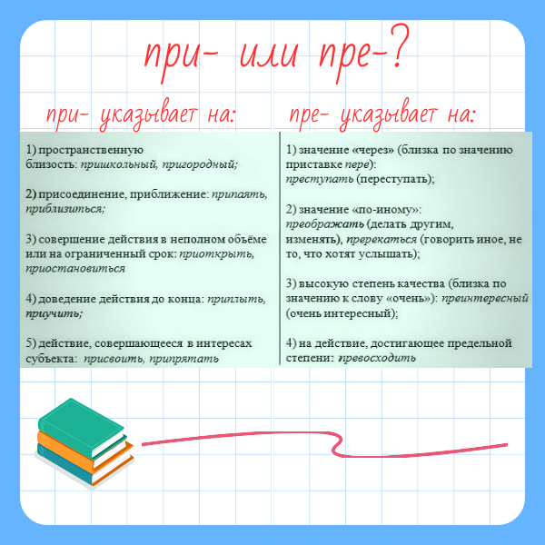 В русском языке приставки «пре-» и «при-» имеют разные значения. От значения зависит и написание приставок. ✔️Приставка ПРЕ- Прекрасный (очень красивый), предобрый (очень добрый) Совершить преступление (переступить закон) ✔️Приставка ПРИ- Имеет значения: Приклеить, прибить Приехать, прилететь Приморский (близко к морю), пришкольный (при школе) Приоткрыть (немного открыть), приостановить (остановить ненадолго) ❗ Важно различать написание близких по звучанию, но разных по значению слов с приставками «пре-» и «при-». Например, пребывать (находиться) - прибывать (приезжать), преклоняться (восхищаться) - приклоняться (наклоняться), превратный (ложный) - привратник (сторож) и др. Как думаете❓ 🤷♀️ Претворить в жизнь или притворить в жизнь? 🤷♀️ Притворить окно или претворить окно?