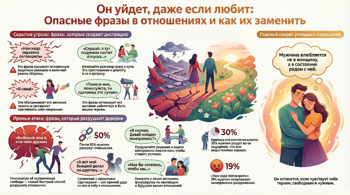 Вы замечали этот момент? Вчера он писал каждые полчаса, отправлял смешные видео и планировал выходные. А сегодня - холодные ответы, «был занят» и онлайн без вашего участия. Часто причина не в том, что «любовь прошла», а в конкретных словах, которые работают как стоп-кран. Мы говорим их из лучших побуждений - чтобы стать ближе, выяснить отношения или пошутить. Но мужская психика считывает это как сигнал тревоги: «Здесь опасно/сложно/душно. Беги». Ниже - 7 фраз-убийц интереса, подкрепленные психологией и цифрами, и советы, как сказать то же самое, но чтобы он захотел вас обнять, а не заблокировать. Классика жанра, от которой у любого нормального мужчины холодеет спина. Даже если вы хотите обсудить покупку кота или отпуск, его мозг моментально включает режим обороны. Почему это работает против вас? Для мужчины эта фраза - анонс проблем. Психологи отмечают, что 19% мужчин испытывают немедленное раздражение и желание закрыться, когда слышат попытки «улучшить» отношения через такие вступлен