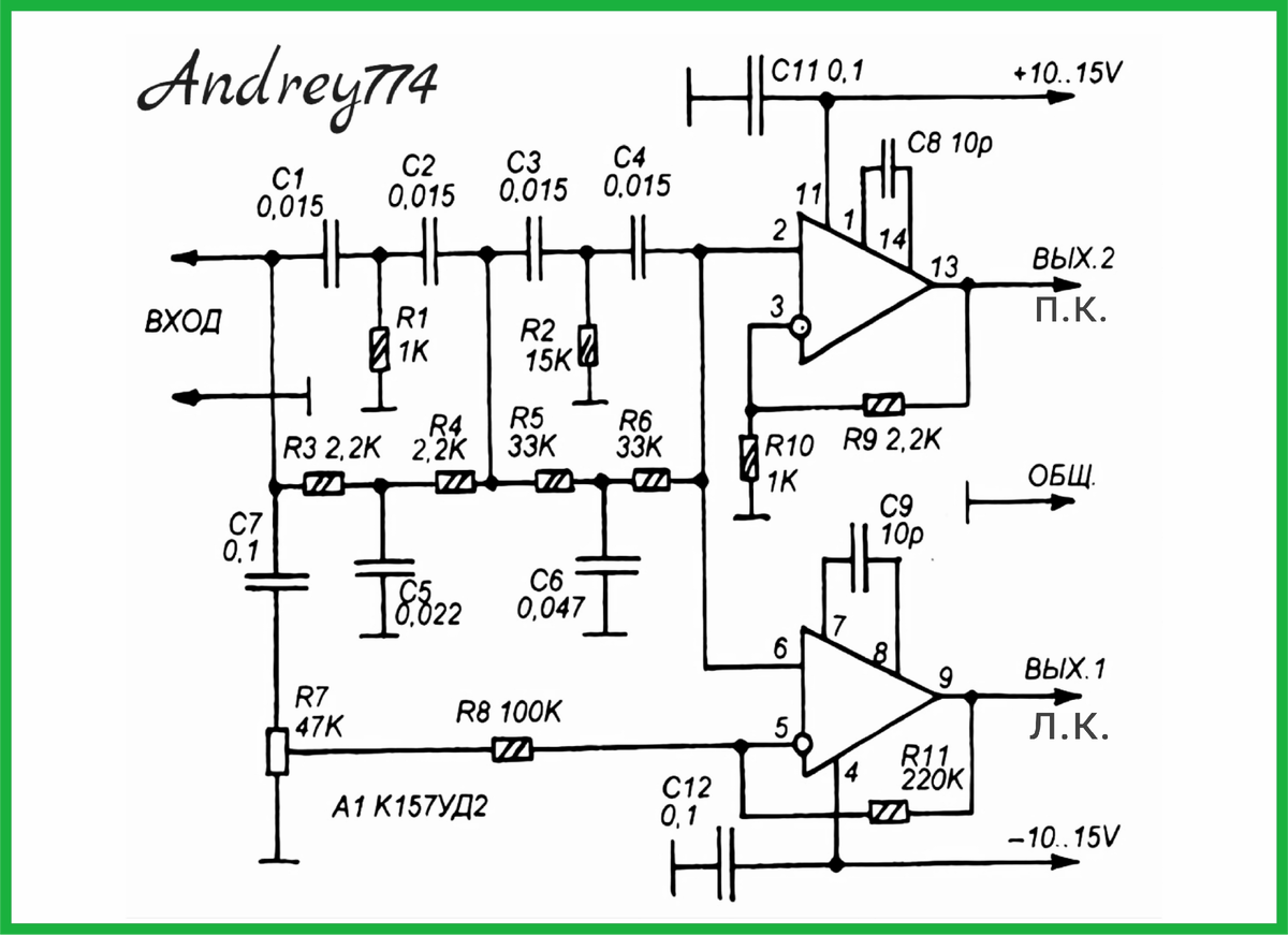 Основу устройства составляет фильтр на базе двух двойных Т‑мостов. Его ключевая функция - формирование различной частотной характеристики для правого и левого каналов, что создаёт эффект пространственного звучания.