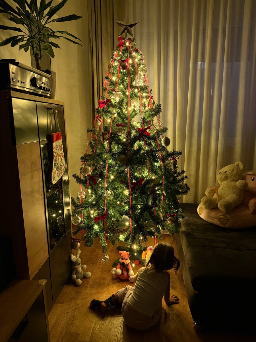 Купили, собрали и нарядили нашу елку. Любуемся ею каждый день.