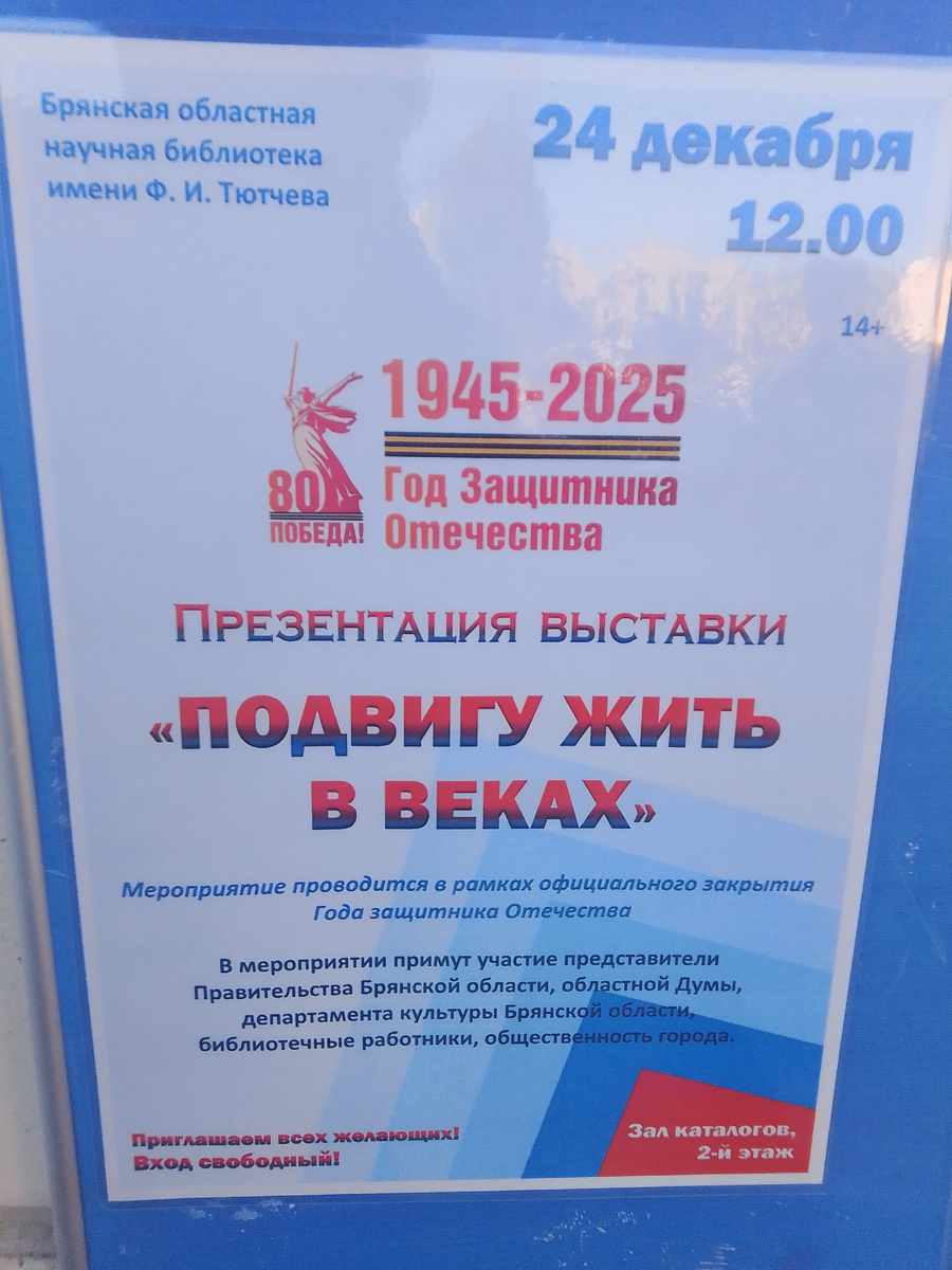 На улице мороз минус 10-15 градусов, а в стенах Брянской научной библиотеки имени Ф. И Тютчева презентация выставки. Тютчев тот самый, который написал "Я встрели Вас и всё былое в отжившем сердце ожило..." и "Умом Россию не понять, аршином общим не измерить, в Россию можно только верить". Я предвзято отношусь к гармонии и баянам. Наверно потому, что воспитан на классике и попсе. Но тут мелодии гармонные создают приятное состояние души. Голос у девушки Дарьи Кравченко был приятным. Народа собралось много. Выступили заместитель Губернатора Никифоров Юрий Михайлович. Особенно отметил важность патриотического воспитания молодежи. Далее вручил книгу, которую издал Губернатор Волгоградской области уроженец брянской земли Бочаров "Сталинград без срока давности". ПЕрвую книгу Бочаров подарил президенту России Владимиру Путину. Никифоров также подарил эту книгу библиотеке Тютчева, Краеведческому музею и Партизанской поляне. Заместитель председателя Брянской областной думы Пронин Владимир Ми