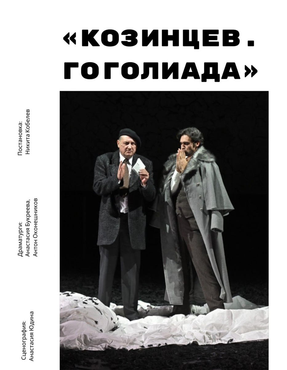 Гоголиада» на Новой сцене Александринского театра: «Съёмка фильма, которого не было» — так определяют жанр спектакля «Козинцев. Гоголиада» его авторы. Режиссёр-постановщик Никита Кобелев, автор идеи Антон Оконешников и драматург Анастасия Букреева обратились к архивным перепискам Козинцева с друзьями, воспоминаниям его современников, наброскам сценария и режиссёрским зарисовкам будущего фильма. Последнее пятилетие жизни Григория Козинцева, наполненное размышлениями о сути творчества, о Гоголе, о пути художника и его предназначении, об идеале и времени воплотилось на Новой сцене не как биографическая работа, а как спектакль-эссе на тему мучительной ответственности творца перед миром, перед прошлым и будущим. На сцене же мир по-гоголевски двойнический. Всё действие снимается оператором на камеру и происходит одновременно в сценическом и киноплане. В глубине два больших экрана, поставленные под углом друг к другу, синхронно транслируют разные видео: съёмки со сцены и архивные кадры писем