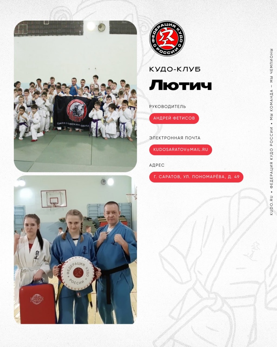 ⠀ Клуб «ЛЮТИЧ» Клуб единоборств «ЛЮТИЧ» приглашает всех желающих, нашу программу входят ударные техники, броски, приемы и другие элементы. Созданные нами условия позволяют комфортно заниматься как новичкам, которые никогда не занимались единоборствами, так и опытным спортсменам. 🥋 Руководитель: Андрей Фетисов 📍 Адрес: г. Саратов, ул. Пономарёва, д. 49 Контакты: ✉️ E-mail: kudosaratov@mail.ru 🔗 Соцсети: https://vk.com/kudo.saratov
