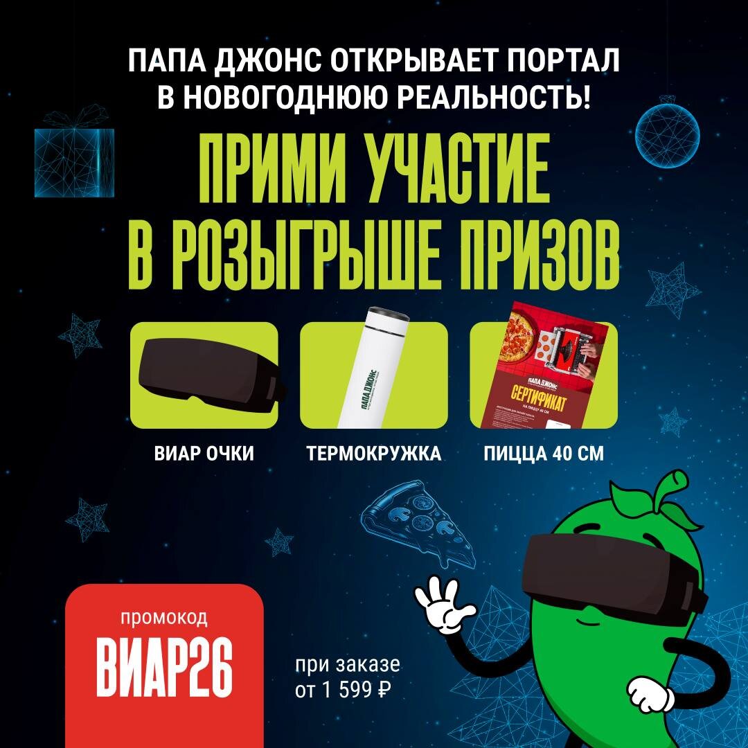 ! Туда, где: 😎 на голове — VR-очки 🍕 в руках — горячая пицца 40 см ☕ а в жизни — фирменная термокружка Как попасть в розыгрыш? Оформляй заказ на сайте или в нашем приложении от 1 599 ₽ и вводи промокод ВИАР26 — все, ты в игре! Участвовать можно до 15 января Итоги подведём 16 января Открывай портал с Папа Джонс — вдруг именно ты наденешь VR-очки первым 😉