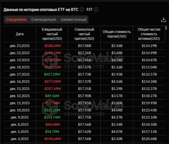 🔸23 декабря спотоые биткоин-ETF зафиксировали общий чистый отток в размере $189 млн, что стало четвертым днем подряд оттока средств