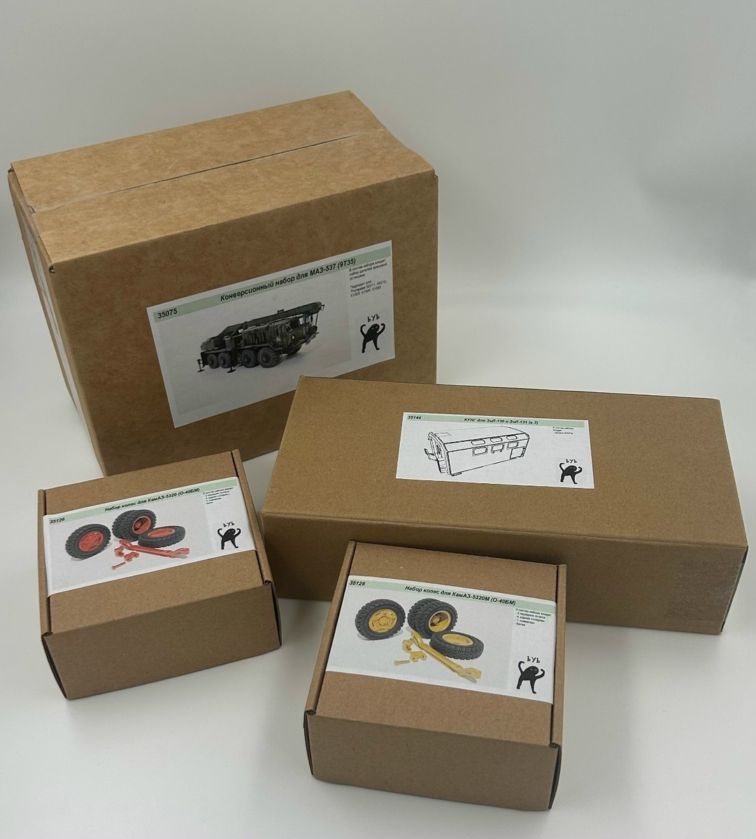 Московская ЪУЪ выпустила на 3D-принтере конверсионные наборы для постройки модели подъемного крана на шасси МАЗ-537, КУНГ для ЗИЛ-130 и колеса с передними балками для КамАЗ-5320/5320М в масштабе 1/35.