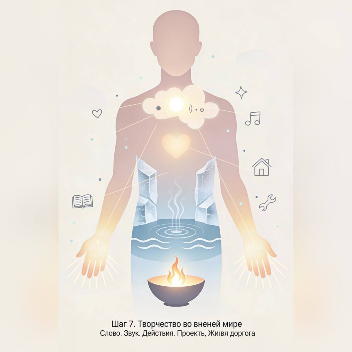 Поднимаясь через грудь и руки к шее, пар встречается с творческими мыслеобразами — тем, о чём человек думает и мечтает, чему уже придал форму внутри. И тогда начинается творчество во вне: через слово, через звук, через руки человек начинает воплощать свои замыслы, превращая найденное «внутри» в живые формы в мире.