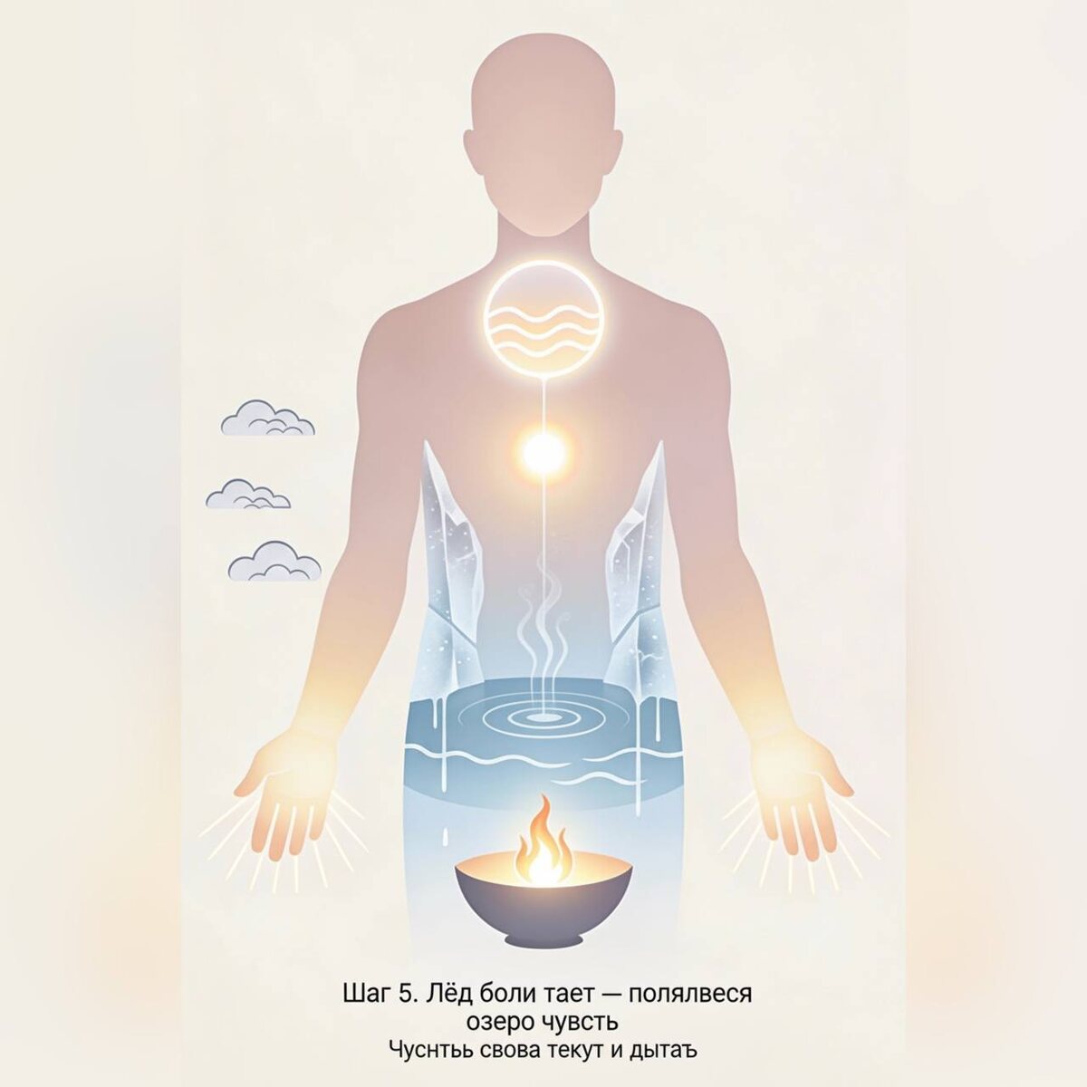 Тёплый пар поднимается вверх и заполняет всё тело, руки становятся живыми, наполняются до кистей паром творчества, и из пальцев начинают струиться лучи творения: желание писать, рисовать, строить, обнимать, делать что‑то своё.
