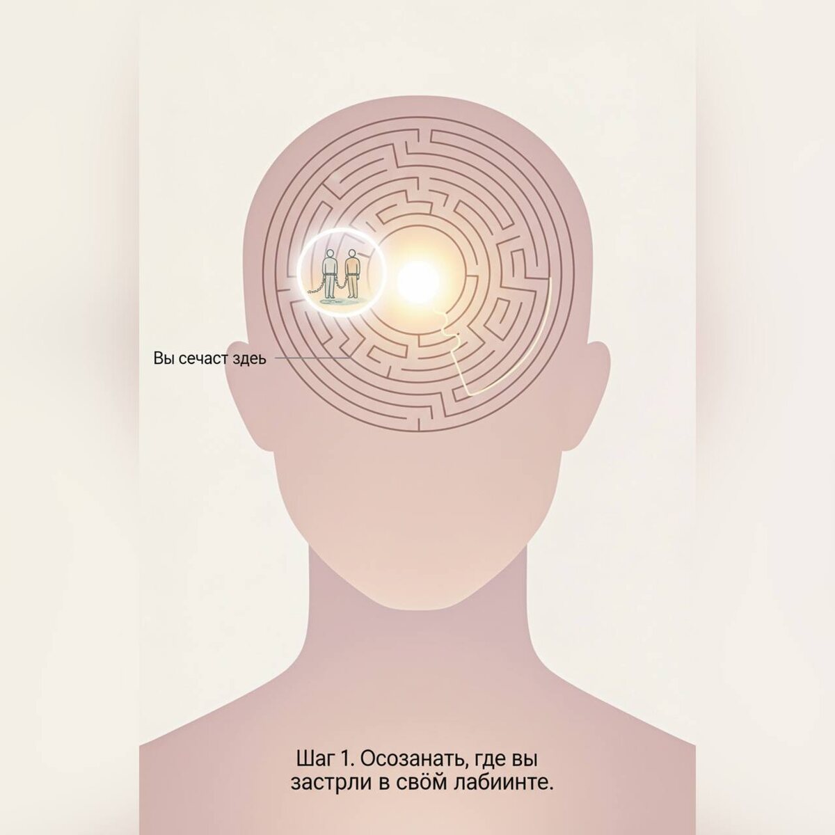 Ты сейчас там, в своей голове, в своем лабиринте мыслей, целей, ценностей, задач, событий и связей. Найти себя в голове, в головном лабиринте страстей, событий, ложных знаний и ложной справедливости — значит заметить, как мысли ходят по кругу и удерживают в старых сценариях, не давая сделать живой шаг. Выйти из этого лабиринта — это увидеть, какие из этих правил и концепций не про вас, а про чужой страх и чужие ожидания. Найти тропу, выйди к центру своего головного лабиринта и провались в свое горло.