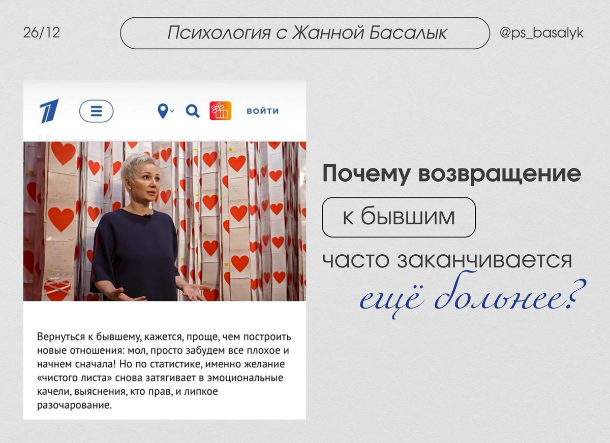 Потому что большинство «ремейков» строятся на иллюзии: «Мы стали другими — значит, всё получится». Но исследования и практика показывают: если не изменился способ строить отношения, то сценарий повторится — быстрее и жёстче. Те же триггеры, те же конфликты, но меньше терпения и больше разочарования. Это важный момент. Иногда — да, стоит попробовать. Но только при трёх условиях: Если хотя бы одного пункта нет — это не вторая попытка, а отсроченный повтор. Не "люблю ли я его/её?", а "если бы мне сейчас было спокойно и хорошо, я бы всё равно хотел(а) именно этого человека?" Если ответ — нет, значит, вас тянет не к нему, а вы от чего-то бежите. С этим сложно разобраться самому, потому что мозг умеет красиво объяснять свои защитные реакции, одиночество воспринимается как угроза, а прошлое всегда кажется понятнее будущего. Именно поэтому тема «вернуться к бывшему» так часто появляется в терапии — не как вопрос любви, а как маркер внутреннего кризиса. Мой эфир с первого канала по этой теме оп