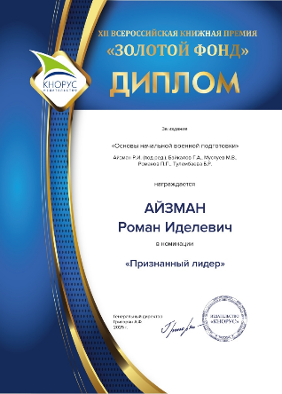Учебник Романа Айзмана получил премию «Золотой фонд» Учебник профессора кафедры анатомии, физиологии и БЖД Романа Айзмана «Основы начальной военной подготовки» стал лучшим в номинации «Признанный лидер» XII Всероссийской книжной премии «Золотой фонд» Роман Айзман, д. биол. наук, профессор, заслуженный деятель науки России, член-корреспондент Международной академии наук высшей школы, Российской академии естествознания, академик Международной академии наук экологии и безопасности жизнедеятельности, академик Академии полярной медицины и экстремальной экологии человека, директор НИИ здоровья и безопасности НГПУ на протяжении более 20 лет является внешним совместителем кафедры анатомии, физиологии и БЖД.