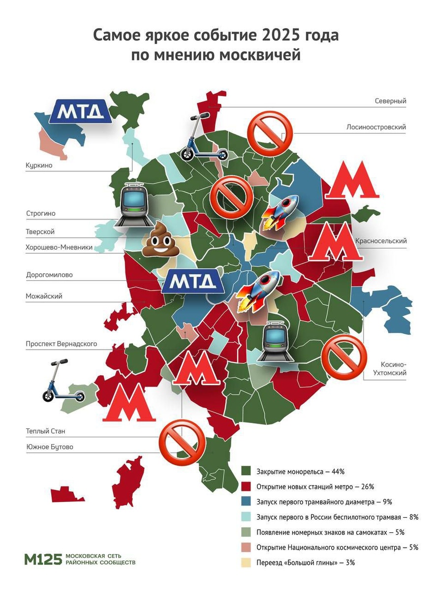 Подводя итоги года, решили спросить у жителей районов Москвы, какое событие они считают самым ярким в уходящем году: 🚝 Закрытие монорельса запомнилось москвичам больше всего — его выбрали 44% районов, включая Южное Бутово, Лосиноостровский и Останкинский 🚇 За Открытие новых станций метро проголосовали 26% — среди них Теплый Стан, Можайский и Северный 🚊 Запуск первого трамвайного диаметра выбрали 9% и это жители Хамовников, Некрасовки и Метрогородка 🚃🚃🚃 Запуск первого в России беспилотного трамвая считают событием года 8%, этот вариант победил в Лефортово, Филевском Парке и Левобережном 🛴 Появление номерных знаков на самокатах выбрали 5% — событие лидирует в Алтуфьево, Внуково и Дорогомилово 🛰 Открытие Национального космического центра считают самым ярким событием 5% — среди них жители Свиблово, Сокольников и Восточного Дегунино 🗿 Переезд «Большой глины» набрал всего 3% голосов — вариант победил в Мещанском, Южнопортовом и Преображенке 🚀 ОбзорчиГ: Москва в кадре ✨ Обзо