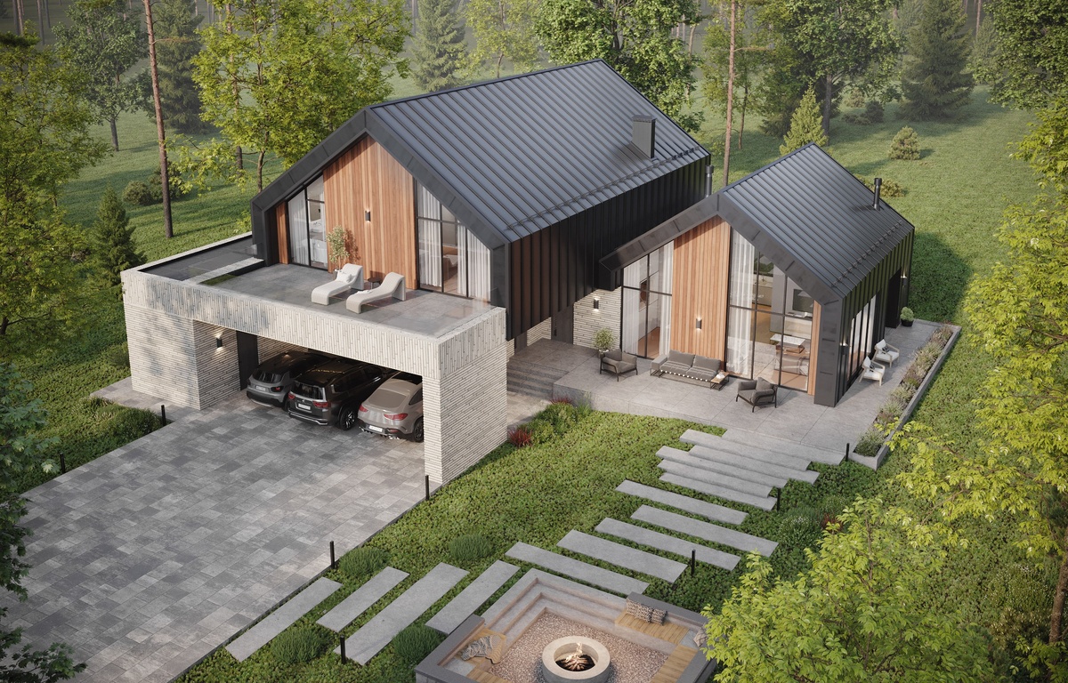 Это масштабный проект площадью 386 м², разработанный нашим проектным отделом для строительства в коттеджном поселке Линтулово. Общая площадь дома – 279 м² Общая площадь террасы и балкона – 81 м² ▫️Кухня‑гостиная 55 м² с шикарным панорамным остеклением и отдельными выходами на террасу и зону барбекю ▫️Хозяйская мастер‑спальня с большим гардеробом, санузлом и собственным балконом ▫️Мастерская с отдельным входом и постирочной ▫️Навес на три авто с системой снеготаяния Также в доме предусмотрен кабинет, мастер-спальня и гостевая, спортзал, 2 санузла и хоз. помещения. Проект получился основательным, а благодаря выбранному стилю дом особенно хорошо впишется в ландшафт коттеджного поселка. #Линтулово
