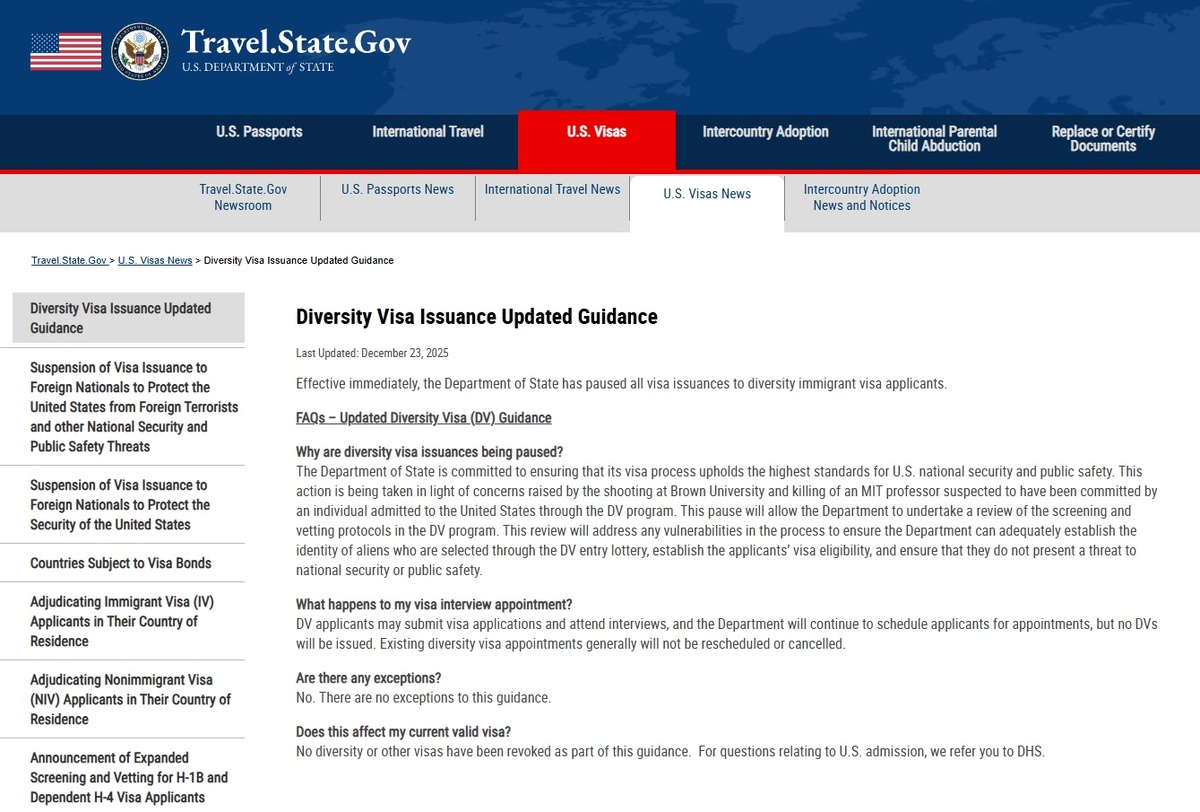 Министерство иностранных дел (Госдепартамент США) немедленно приостанавливает выдачу виз в рамках программы Diversity Immigrant Visa (DV, «лотерея грин-карт»). Почему приостанавливают выдачу виз?
