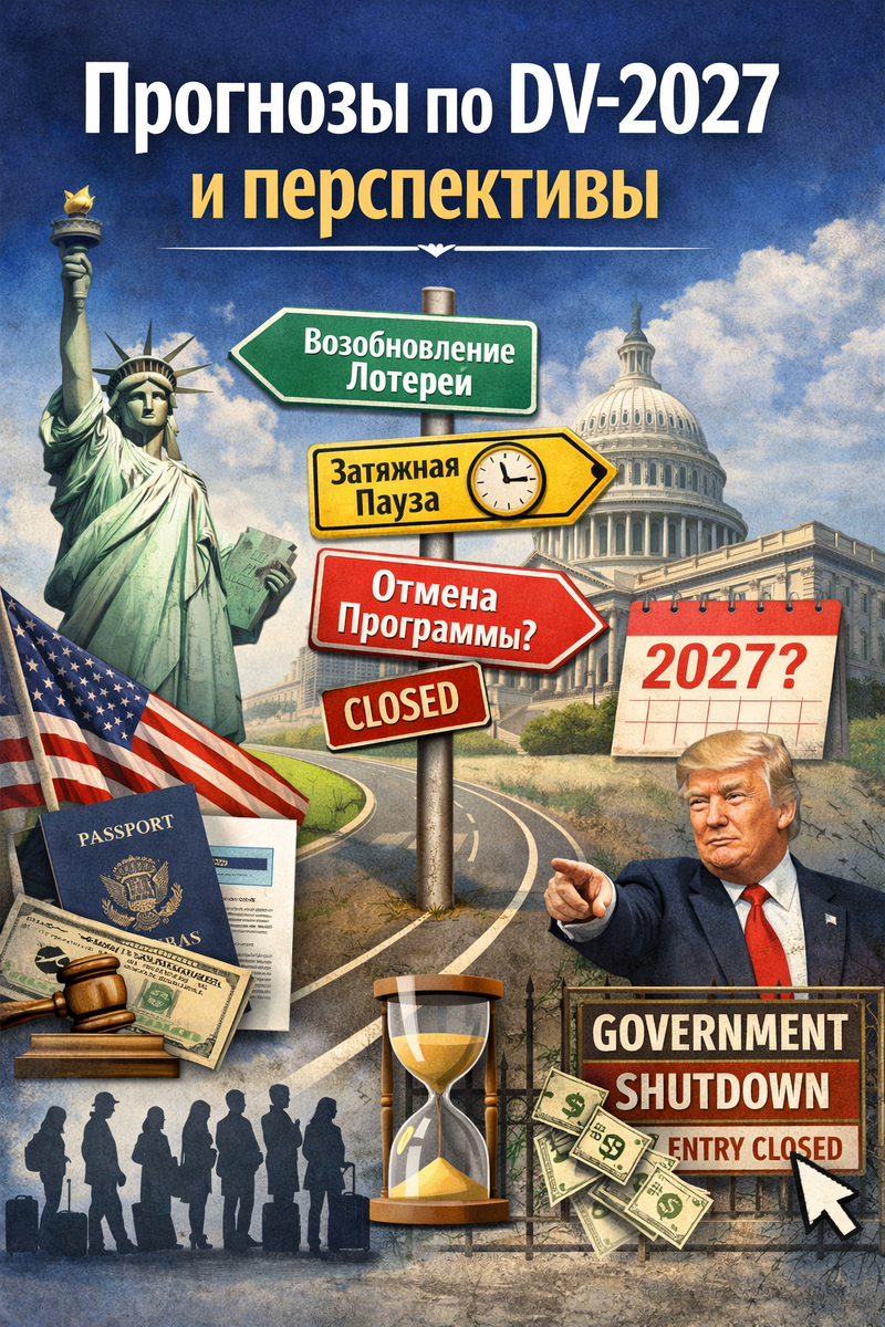 Будет ли лотерея DV-2027? На текущий момент (декабрь 2025): регистрация DV-2027 официально не открыта, даты не объявлены. Программа находится в процессе административной паузы, а не отмены по закону. Сценарий 1 — восстановление регистрации Если после внутреннего пересмотра процедур национальной безопасности администрация решит продолжить программу, Госдеп может опубликовать официальные инструкции и запустить регистрацию для DV-2027. Это возможно, потому что ничто в законе не запрещает Госдеп продолжать программу. (в рамках текущего законодательства, если пауза будет снята). Сценарий 2 — продолжение административной паузы Пауза может продолжаться несколько месяцев или до конца фискального года 2027, особенно если результаты проверки потребуют изменения процедур или дополнительных правил безопасности. В этом случае программа DV-2027 может так и не начаться в стандартные сроки. Сценарий 3 — попытка законодательного изменения Если Трамп и сторонники в Конгрессе будут активно лоббировать от