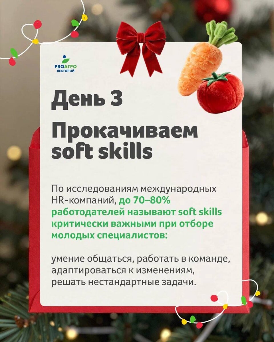 В агросфере без «мягких» навыков никуда: работа идёт в команде, решения нужно принимать быстро, а общение — часть любой задачи. Поэтому именно эти навыки помогают студентам выделиться на практике, быстрее расти и увереннее заходить в профессию. Какие soft skills особенно важны в АПК: • Коммуникация — чтобы понятно объяснять и согласовывать действия; • Командная работа — большинство процессов делается вместе; • Ответственность — от твоего решения зависит качество и безопасность продукта; • Гибкость — условия и задачи могут меняться ежедневно; • Стрессоустойчивость — особенно важна в сезонные пики. Если хочешь подтянуть эти навыки, начни с самого базового — умения общаться. Мы собрали подборку лекций, которые помогут разбираться в коммуникации и уверенно разговаривать даже в непростых ситуациях. 🎄 Лекции по психологии общения
