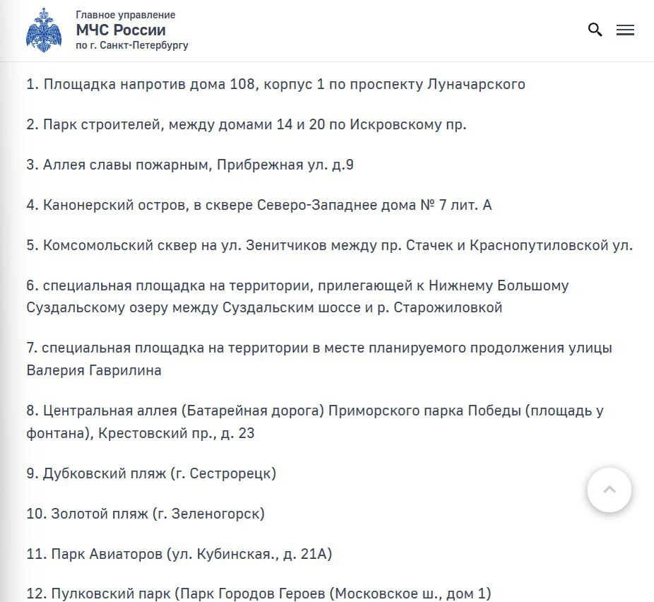 В разных районах Северной столицы обустроили 37 таких мест. Среди них — Морская набережная за гостиницей «Прибалтийская», Приморский парк Победы, а также парки — Героев-Пожарных, Авиаторов, Полюстровский, Пулковский, Малиновка и другие. Полный список площадок опубликован на сайте ГУ МЧС по Петербургу. Скриншоты: сайт ГУ МЧС по Петербургу Подпишись на Город+: Telegram|MAX|ВК