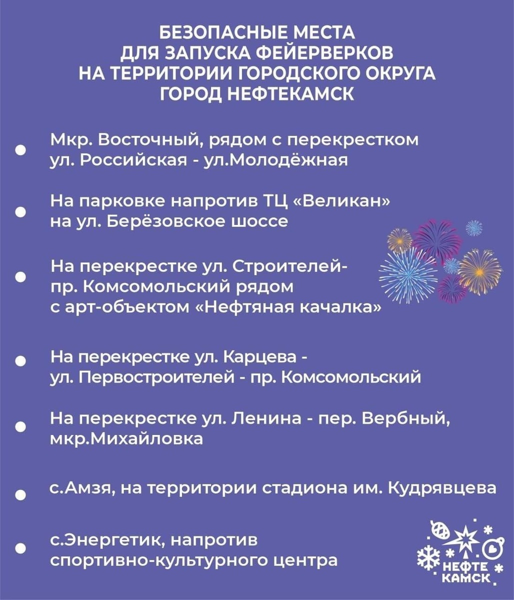 В Нефтекамске определены следующие площадки для использования пиротехнических изделий: ❗ Мкр. Восточный, рядом с перекрестком ул. Российская - ул.Молодёжная; ❗ На парковке напротив ТЦ «Великан» на ул. Берёзовское шоссе; ❗ На перекрестке ул. Строителей-пр. Комсомольский рядом с арт-объектом «Нефтяная качалка»; ❗ На перекрестке ул. Карцева - ул. Первостроителей - пр. Комсомольский; ❗ На перекрестке ул. Ленина - пер. Вербный, мкр.Михайловка; ❗ с.Амзя, на территории стадиона им. Кудрявцева; ❗ с.Энергетик, напротив спортивно-культурного центра. Настоятельно рекомендуем жителям и гостям города соблюдать установленные ограничения, поскольку речь идёт не только о штрафах, но и о жизнях и имуществе наших сограждан. 👉 Подписаться на канал