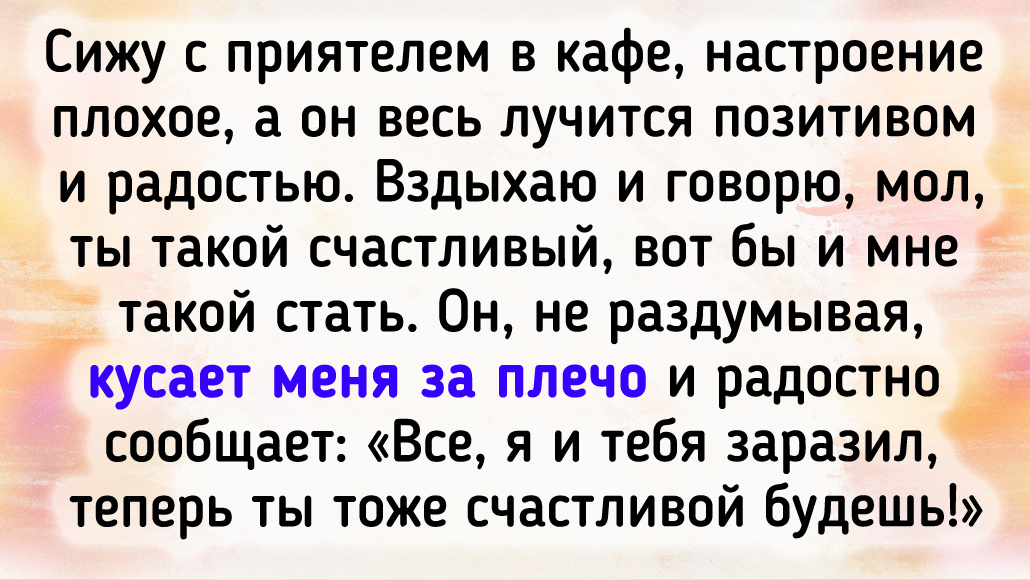 - Сестра не ходит после автокатастрофы. Прошло много времени, раны зажили, проходит реабилитацию, а сама пойти никак не может. Врачи говорят, что такое бывает и нужен какой-то толчок. Сегодня гуляли в парке, снег тает, везде лужи. Мимо нас проезжает велосипедист на всей скорости и обрызгивает сестру. Я в панике достаю салфетки, пытаюсь ее успокоить, а она отталкивает меня, встает с коляски, кричит благим матом и кое-как ковыляет за этим придурком. Пока поняли, что произошло, сестра плюхнулась в ту же лужу и зашлась заразительным смехом. Спасибо, чувак, отличный толчок!
