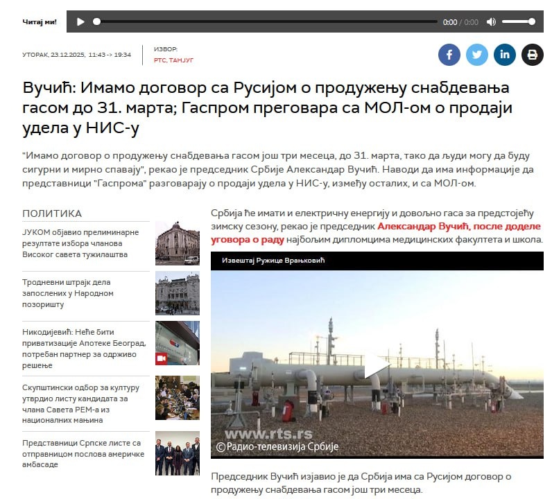 Герои одного известного американского сериала постоянно говорят, что зима близко. Мы и заметить не успели, как она уже наступила. На улице становится все холоднее и вопрос энергетический стабильности Сербии выходит на первый план не только на бытовом, но и на политическом уровне. 🔸Президент Сербии Александр Вучич заявил, что удалось договориться о продлении поставок газа из России ещё на три месяца — до 31 марта. Речь идёт о временном решении, которое закрывает наиболее чувствительный период отопительного сезона. 🖍Для сербской экономики это критично. Газ остаётся опорным ресурсом для отопления, электроэнергетики и промышленности, а альтернативные объёмы в короткие сроки недоступны. Без пролонгации страна входила бы в февраль–март с риском дефицита и резкого роста издержек. 🚩Долгосрочный контракт завершён, а переговоры о новой модели поставок идут в условиях нестабильного европейского рынка и внешнего давления. В такой конфигурации краткосрочные соглашения становятся не компромиссом,