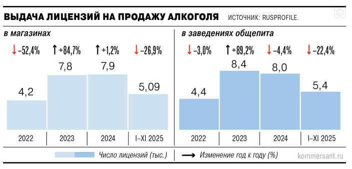 В январе—ноябре 2025 года в России было выдано около 10,5 тыс. новых лицензий на розничную продажу крепкого алкоголя — на 26,9% меньше, чем за аналогичный период 2024 года. Такие данные приводит сервис проверки и анализа контрагентов Rusprofile. Падение связано в первую очередь с сокращением спроса на крепкий алкоголь на фоне устойчивого роста цен, отмечают эксперты. Дополнительное давление оказывают региональные ограничения на торговлю спиртным — в ряде субъектов РФ действуют строгие правила, включая запреты на продажу в выходные, праздничные дни и в непосредственной близости от социально значимых объектов. До сентября 2025 года одна лицензия могла оформляться сразу на несколько торговых точек, однако с осени в силу вступили поправки, согласно которым каждая точка розничной торговли или общепита теперь должна иметь отдельное разрешение. Ранее выданные лицензии сохраняют силу до окончания срока действия. Наибольшее сокращение зафиксировано среди ритейлеров: выдача лицензий для магазино