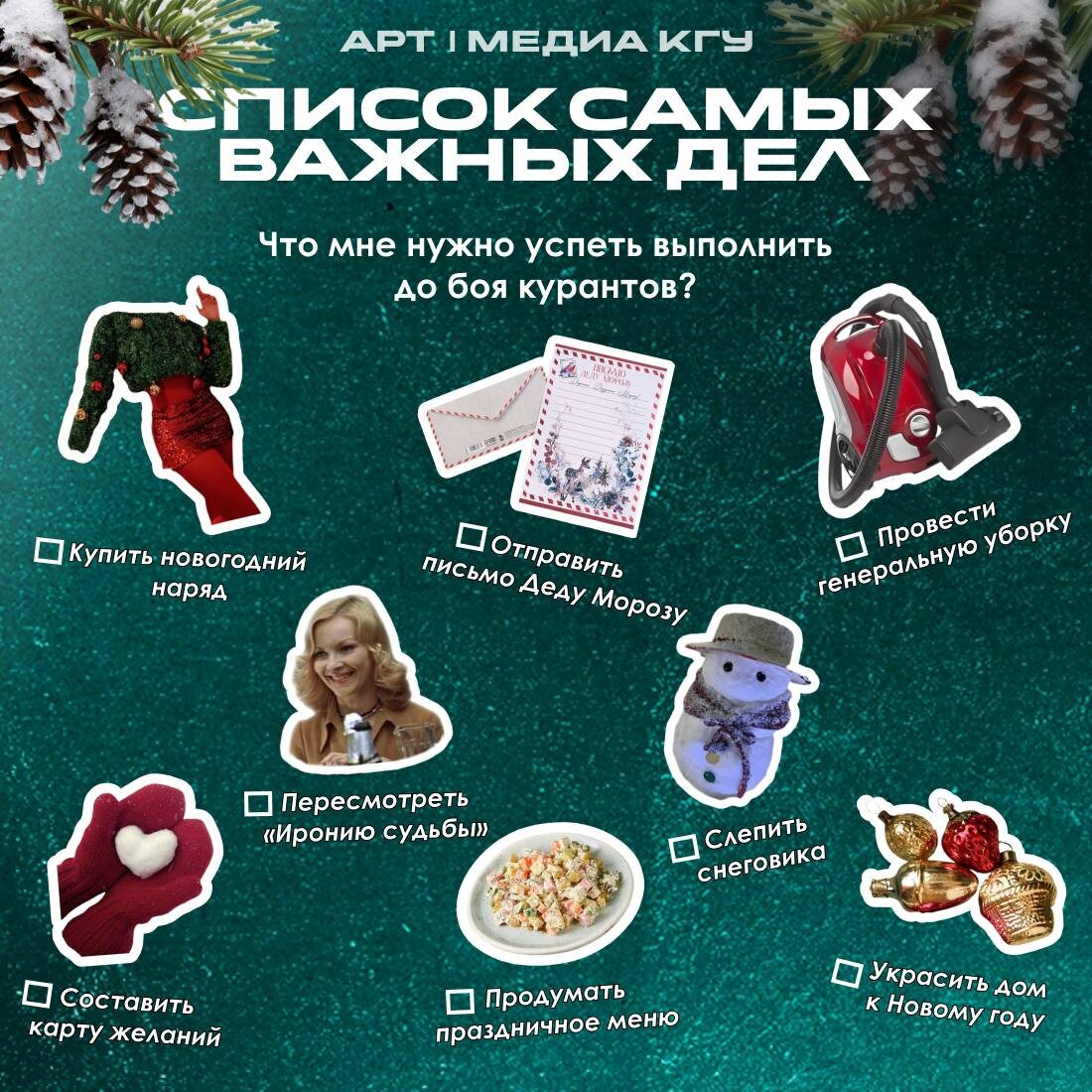 ! Чтобы встреть Новый год в спокойствии и гармонии, лучше составить чек-лист📃 Сохраните список важных дел от студенческой медиакоманды «АРТ», который нужно завершить до того, как пробьют куранты. Проверьте, если все ли у вас готово к волшебству? ❤️КГУ в MAX
