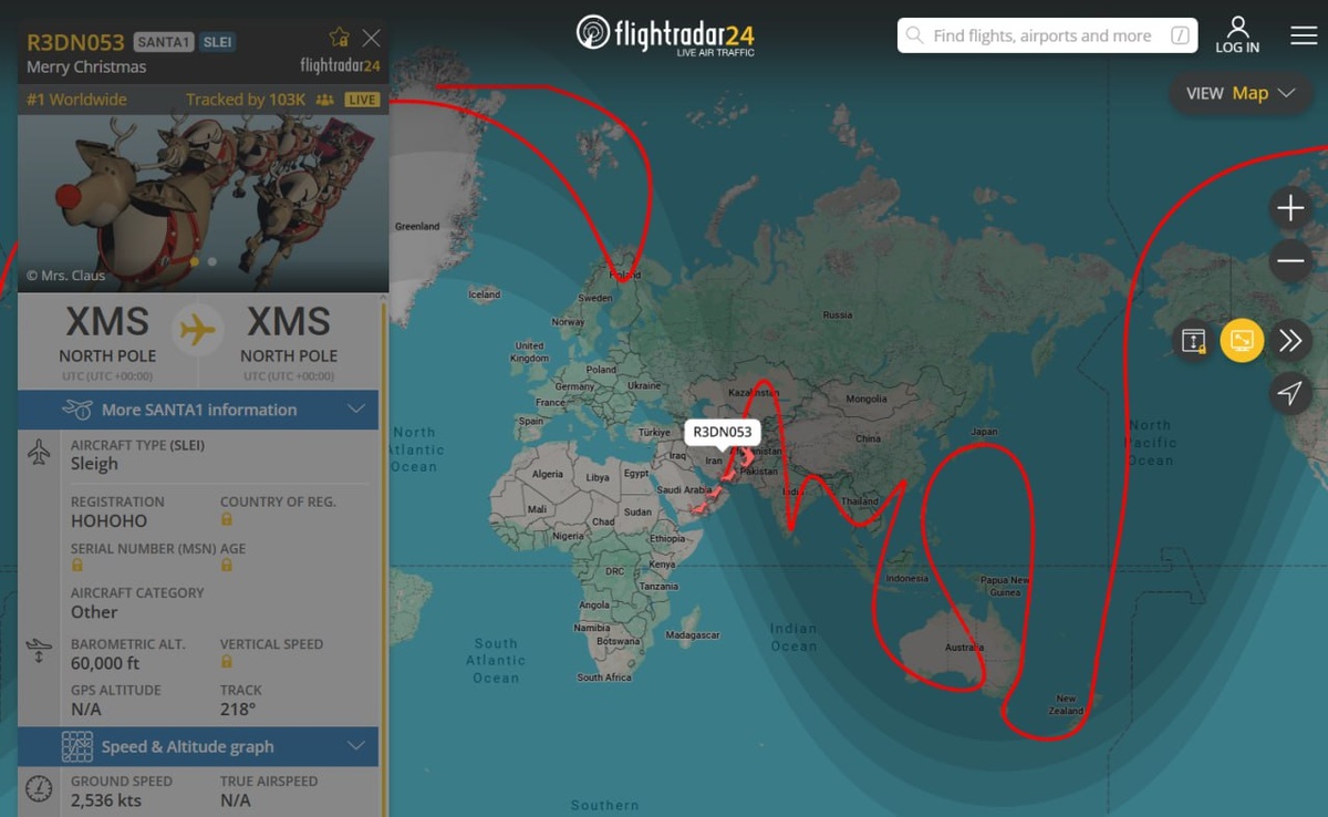 🎅 Санта-Клаус вылетел сегодня с Северного полюса и посещает страны и города по всему миру, — данные Flightradar