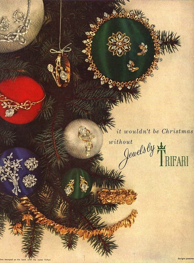 Не так давно мне попалась на глаза старая реклама TRIFARI и я подумала, что это совершенно гениально. А главное, что есть огромный простор для фантазии и творчества, и уж конечно, такая елка будет одна в целом свете- только ваша!