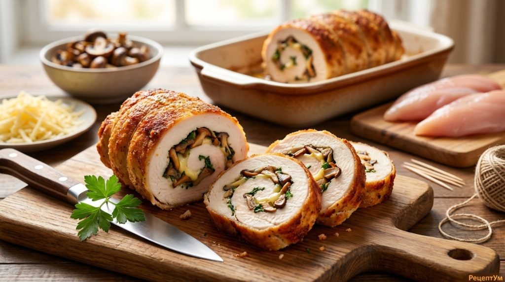 Звонит подруга: «Марь, завтра приеду с мужем на ужин, можно?» Конечно, можно! Но что готовить? Хочется чего-то эффектного, но не слишком сложного… Открываю холодильник — куриная грудка, шампиньоны, сыр. «А что, если сделать рулет?» — думаю я. Куриный рулет с грибами и сыром выглядит по-праздничному, а готовится проще котлет! Когда подруга увидела нарезанный рулет с красивой спиралью начинки, ахнула: «Ты в кулинарной школе училась?» Нет, просто знаю один секрет… Этот рулет из куриного филе с грибами в духовке получается сочным, ароматным, а главное — очень красивым на разрезе! Главный секрет сочного рулета — не пересушить курицу. Используйте термометр: внутренняя температура должна достичь 74°C. Если термометра нет, проткните рулет в самом толстом месте — сок должен быть прозрачным.При отбивании не переусердствуйте — слишком тонкое мясо порвётся при сворачивании. Идеальная толщина 7-8 мм. Начинку выкладывайте тонким слоем, иначе рулет развалится.Для более яркого вкуса добавьте в начинку