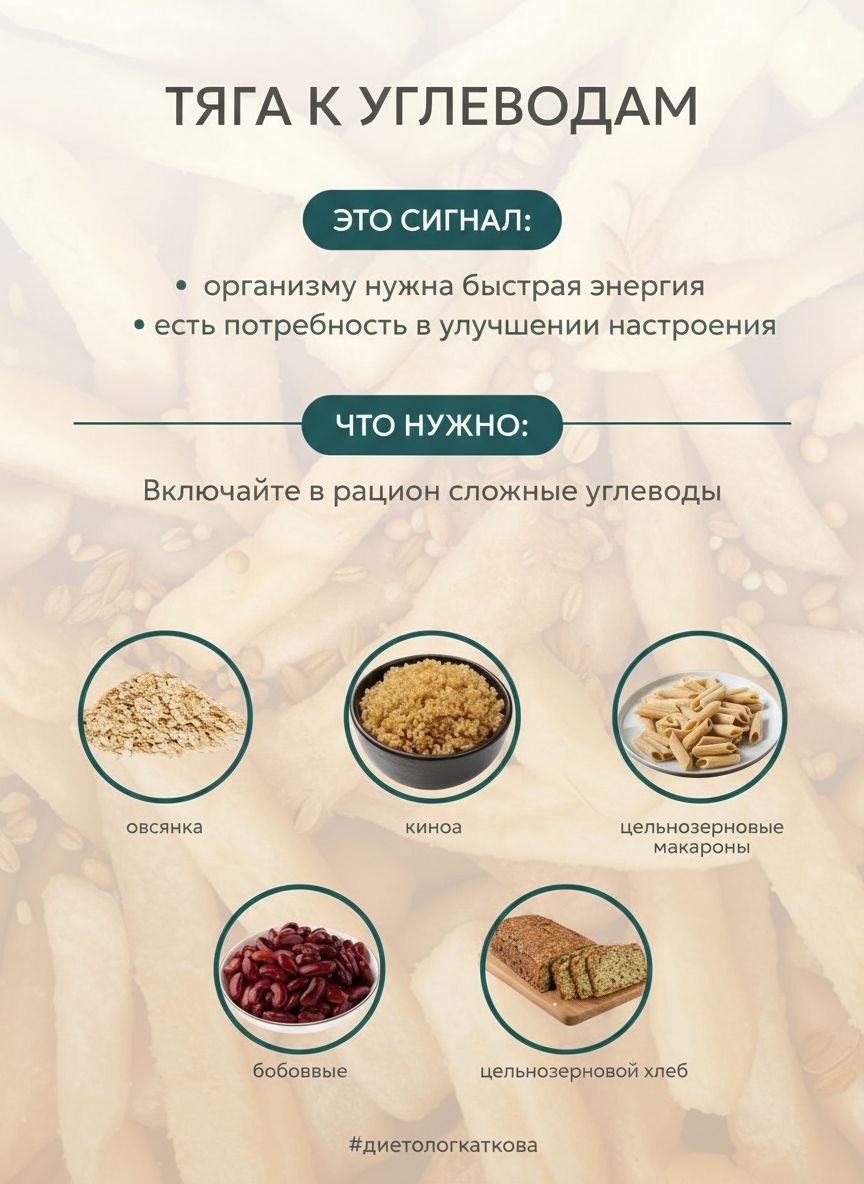 ? Организм нуждается в быстрой энергии, особенно когда есть потребность в улучшении настроения. Сложные углеводы – это то, что нужно! Включайте в рацион овсянку, киноа, цельнозерновые макароны, бобовые и цельнозерновой хлеб. Эти продукты обеспечат вас энергией на долгое время и помогут справиться с тягой к сладкому и соленому. Хотите сбалансировать питание и избавиться от вредных привычек? Диетолог Екатерина Каткова поможет вам составить персональное меню! Свяжитесь с нами по номеру 8-926-926-65-87 и начните путь к здоровому образу жизни уже сегодня! #диетологкаткова