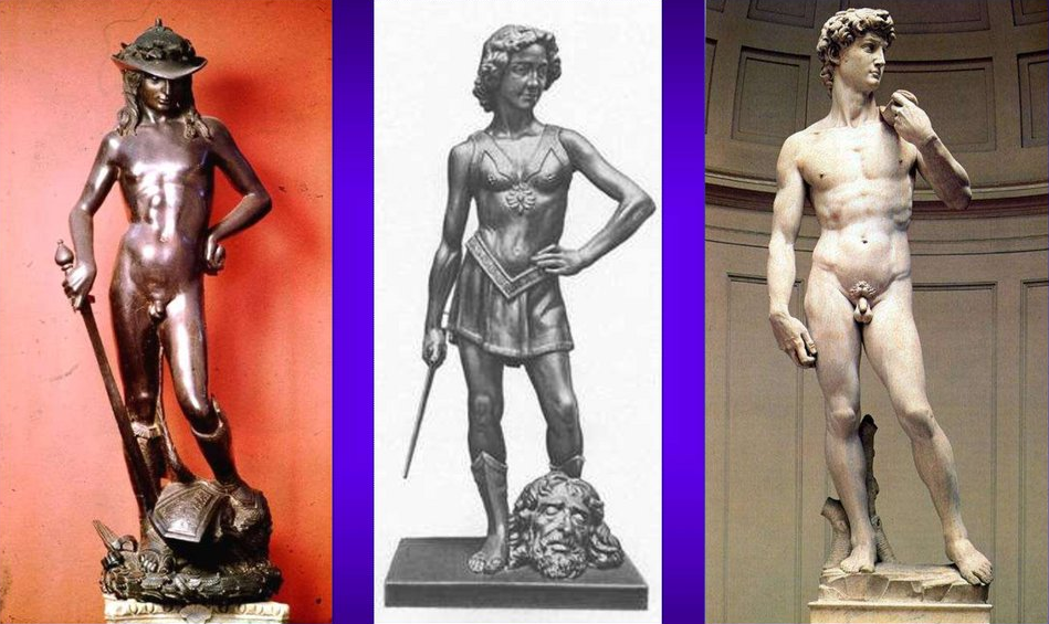 С точки зрения истории искусств особенно выделяются три скульптуры Давида – работы Донателло, Вероккьо и Микеланджело. Многие скульпторы, и упомянутые мастера в разное время создавали и другие произведения по этому сюжету. Однако именно три этих Давида стали ключевыми этапами в развитии ренессансной скульптуры и художественного мышления. Они не только превзошли все остальные версии по художественной значимости, но и задали ориентиры, на которые равнялись последующие поколения мастеров.