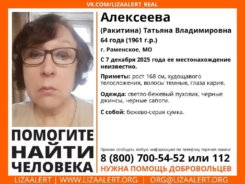 Может находиться в Вашем районе! Алексеева (Ракитина) Татьяна Владимировна, 64 года, Раменское, МО. С 7 декабря 2025 года ее местонахождение неизвестно. Контакты для свидетельств: Инфорги: Динка (Ирина) 8(913)036-88-05, Джан (Жанна) 8(902)565-22-70 Гор. линия ПСО "ЛизаАлерт": 8(800)700-54-52 (круглосуточно). ________ Присылать новость @mstislavz 👉 Обсудить в чате ЖК 👉 Подписаться на канал 📲 Мы в MAX