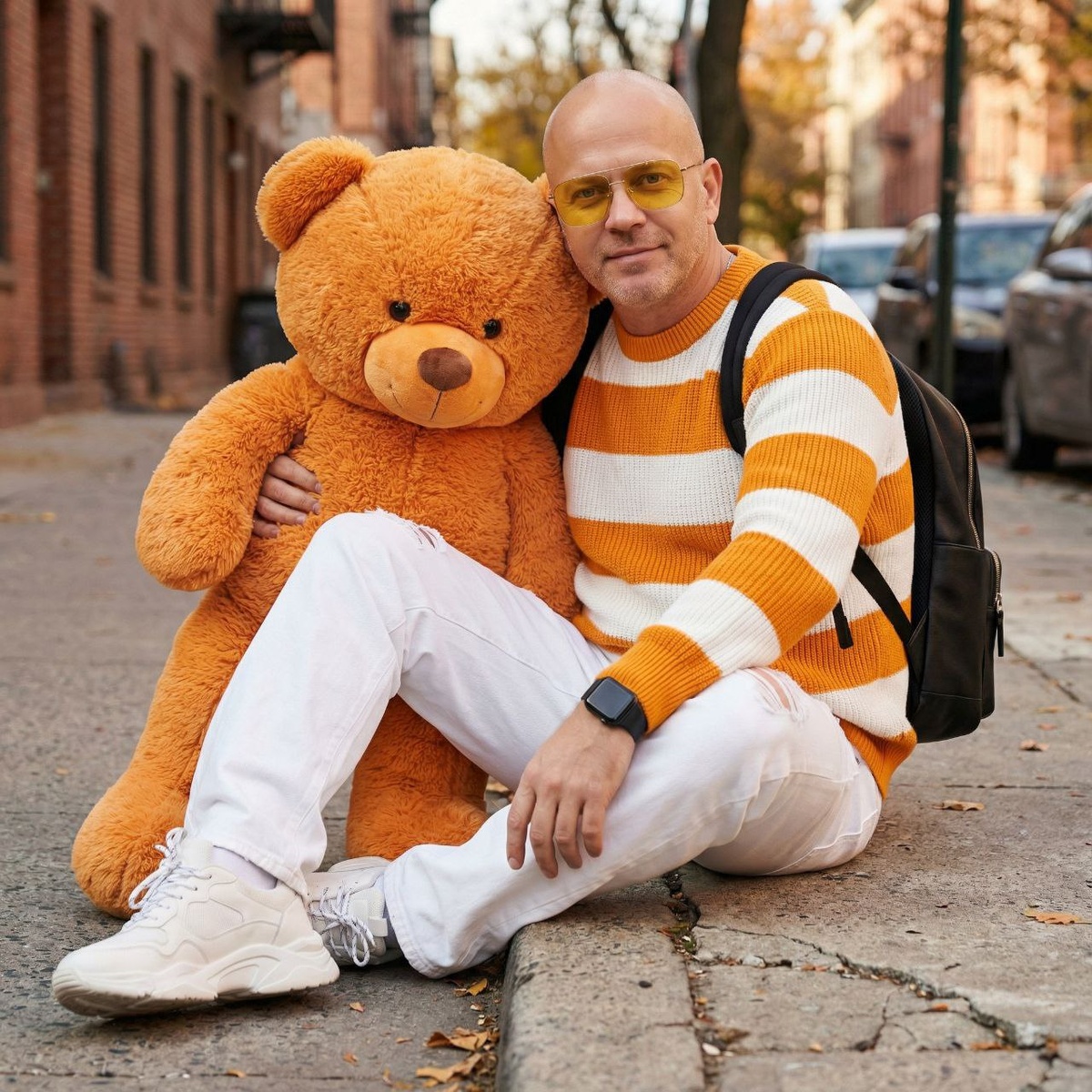 главного персонажа. Лицо должно оставаться на 100% ИДЕНТИЧНЫМ загруженному изображению. Свитер в оранжево-белую горизонтальную полоску, Свободные белые рваные джинсы,Белые модные кроссовки, Черные смарт-часы Apple. Черный рюкзак на одном плече. Повседневный уличный стиль. Молодой человек непринужденно сидит на тротуаре у дороги. Одна нога согнута, другая расслаблена вперед. Большой оранжевый плюшевый мишка сидит рядом с ним. Одна рука обнимает мишку за плечо. Мишка слегка наклоняется к мужчине. Естественная расслабленная поза. Мягкая улыбка / спокойное выражение лица. Милая, уютная, эстетичная атмосфера ДЕТАЛИ ПЛЮШЕВОГО МЕДВЕДЯ: Один БОЛЬШОЙ оранжевый Плюшевый мишка. Мягкий, пушистый мех. Высококачественный реалистичный плюшевый мишка (не мультяшный). Поза сидящего мишки такая же 👉Все ссылки ТУТ 👉канал в Дзен 💰Donate