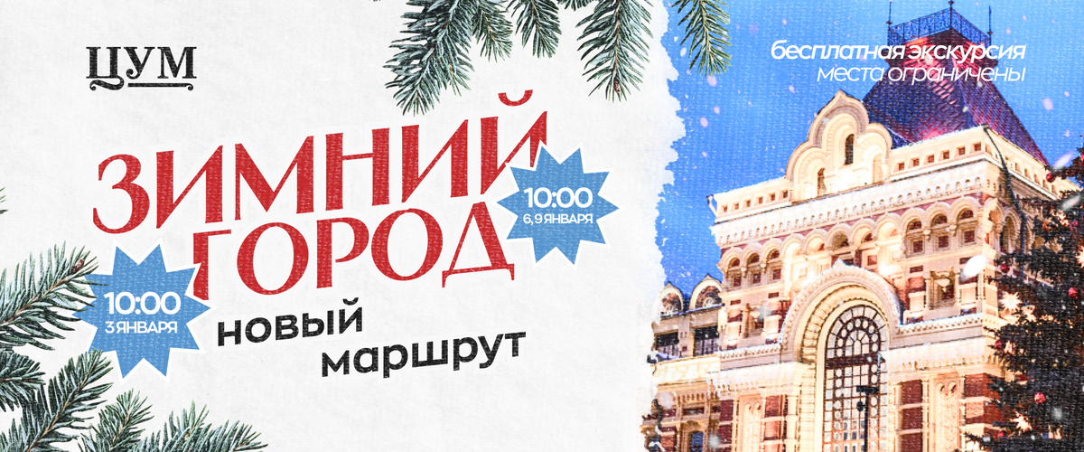 Новый экскурсионный маршрут от ЦУМа по заснеженному Нижнему Новгороду, раскрывающий праздничную атмосферу города. Дата и время проведения: – экскурсии запланированы на 3, 6 и 9 января 2026 года, начало в 10:00. Место сбора: – участники собираются у фонтана, расположенного у Главного ярмарочного дома. Маршрут экскурсии: * Главный ярмарочный дом * Дом Г.В. Дюршмидта * Набережная на улице Марата * ЦУМ О чём расскажут на экскурсии: – Программа охватывает различные аспекты истории и культуры Нижнего Новгорода, включая жизнь и творчество выдающихся личностей, а также художественное отражение города в работах мастеров. Особое внимание будет уделено первым вольным хлебопашцам из рода Вяхиревых и реактивному истребителю, установившему мировой рекорд. Также будут представлены новогодние предсказания и другие элементы праздничного новогоднего настроения. Все участники получат памятные подарки, а по завершении прогулки будет организовано чаепитие. Экскурсия бесплатная, но необходимо зарегистриров
