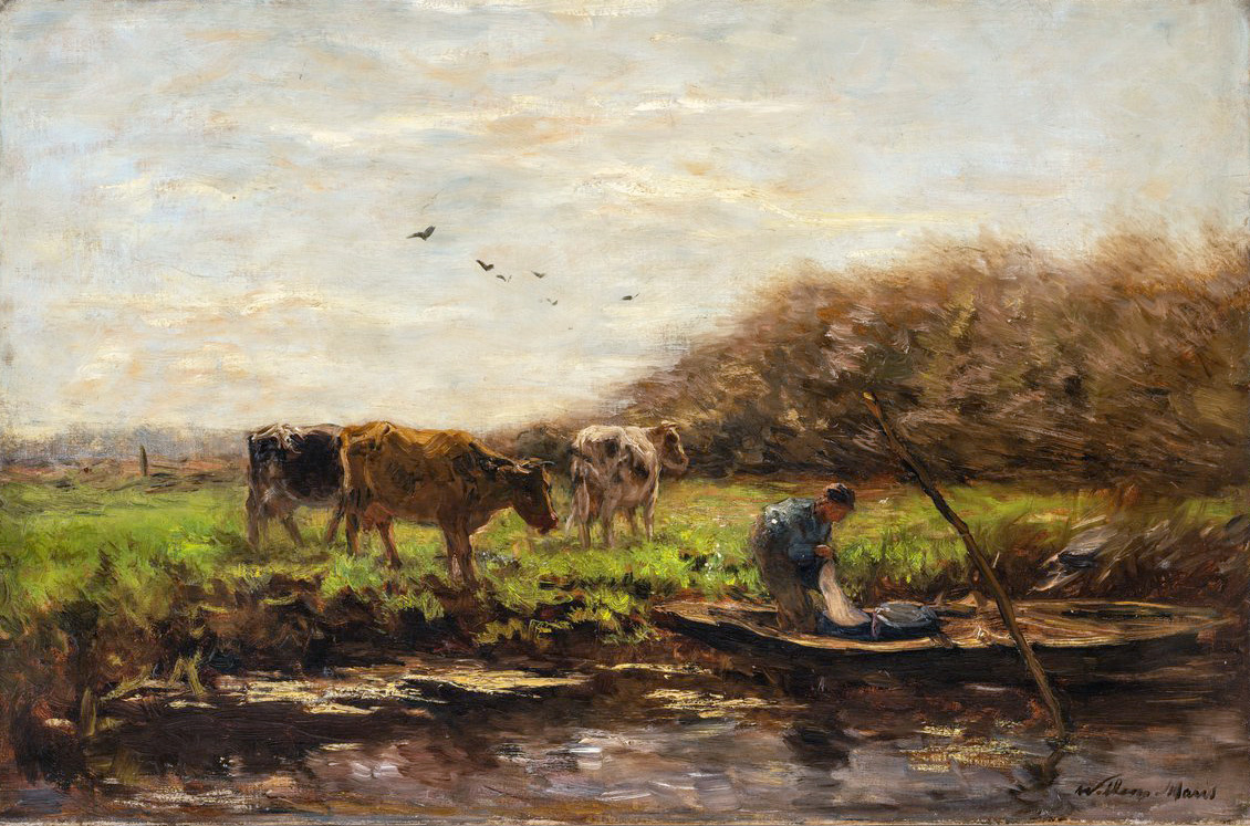 Виллем Марис (1844-1910) был выдающимся представителем Гаагской школы и младшим из знаменитых братьев Марис. В его работах обычно изображены коровы, утки, пастбища и каналы. Большое влияние на него оказал голландский художник XVII века Паулюс Поттер. Хотя его обычно относят к художникам-анималистам, Марис рассматривал животных лишь как второстепенные элементы в мире природы, поэтому его также можно по праву считать художником-пейзажистом. Помимо картин, Марис также создавал гравюры на меди и акварели; он даже участвовал в основании Голландского общества рисования, которое было основано в 1876 году. Целью общества было добиться признания акварели как самостоятельного произведения искусства: до тех пор зрители ассоциировали эту технику просто с эскизами. С 1880 года Марис использовал свободный стиль письма, за что иногда заслужил прозвище "импрессионист Гаагской школы". Именно в этот период он написал картину «Коровы на пастбище», которая была приобретена Музеем изящных искусств в