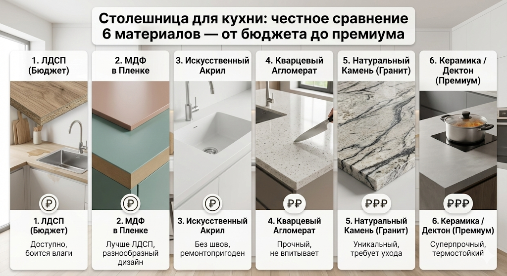 Столешница — это не просто поверхность, на которой вы режете овощи. Это рабочая лошадка кухни, которая ежедневно терпит удары ножом, горячие сковородки, пролитый кофе и агрессивную бытовую химию. Выбрать правильный материал — значит избавить себя от головной боли на годы вперёд. Разберём все популярные варианты без прикрас.