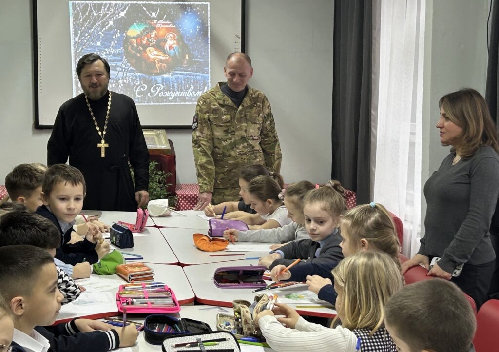 18 декабря 2025 года в Центре «Покров» при Луневской средней общеобразовательной школе прошли очередные занятия, посвященные приближающемуся празднику Рождества Христова. Настоятель Покровского храма д. Мышецкое г.о. Химки протоиерей Александр Азаров представил учащимся вторых классов красочную презентацию с рассказом о празднике и его традициях. Далее к ребятам обратился член ассоциации ветеранов СВО г.о. Химки Антон Зенькович, который рассказал о том, что участники специальной военной операции хранят все подарки и тексты, которые им присылают школьники из разных регионов страны. Бойцы берегут полученные письма и открытки, кладут в нагрудные карманы и часто называют их «вторым бронежилетом». Дети написали воинам письма с теплыми словами, поздравлениями и рисунками – послания будут отправлены в зону СВО к празднику Рождества Христова. А в завершение занятий отец Александр и Антон Зенькович раздали участникам сладкие угощения.
