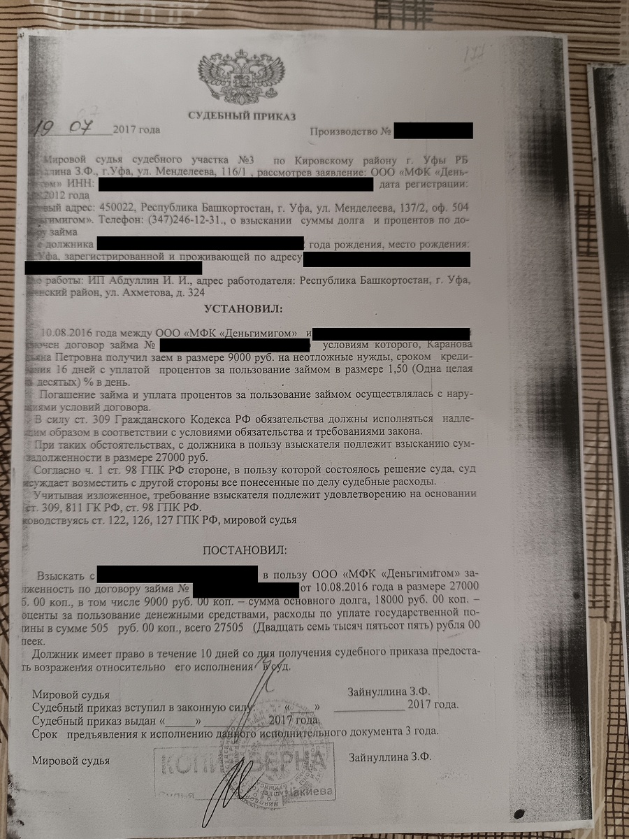 Микрофинансовые организации (в нашем случае это ООО «МКК Деньгимигом») часто используют тактику «судебного приказа». Они подают заявление мировому судье, судья выносит приказ без вызова сторон, а копия приказа отправляется по почте на адрес вашей старой прописки.
