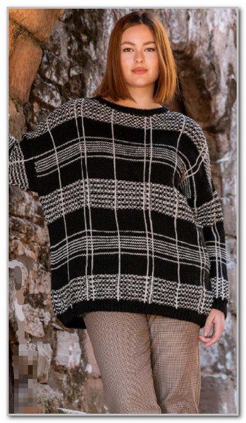 Перевод из журнала "Piu Maglia", № 51, 2025 г. Пуловер в клетчатом узоре, выполненного в классических бежевом и черном цветах пряжи. Вертикальные полоски вяжутся крючком по готовому полотну.